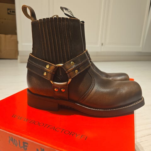 Itselläni jalka 39,5 ja sopivat mutta toisessa jalassa paha vaivasenluu estää käyttämisen. Vahvaa paksua nahkaa ja boots factoryn laatutyötä. Väri tumman ruskea. Hienot koristeompeleet kuten kuvista näkyy. Voin lähettää kulut ostajalle.