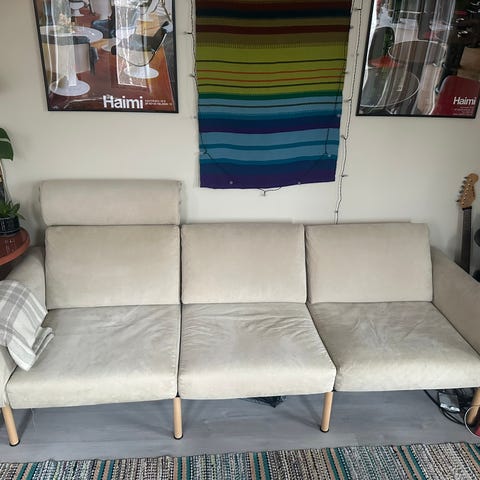 Kolmen istuttava Kukkapuron suunnittelema sohva Marimekon pienet kivet paksulla verhoilukankaalla. Sohvan uudet päälliset teetetty verhoilijalla. Runko hyvä ja tukeva, kromipinnassa sanomista, ei näy juurikaan.