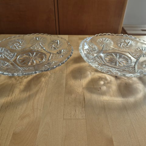 Upea setti vanhoja kirkkaan sini/vihreän tarjoilu lasikulhoja. Neliönmuotoisia ja paksu lasi. Nämä ovat luultavasti valmistettu kierrätystä lasista ja näissä on joustavat linjat. Astioissa on 1900-luvun puolivälin moderni tyyli.