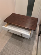 Pöytä on tukeva ja muuten hyvässä kunnossa, mutta pöydän kannessa on jälkiä ja kolhuja.