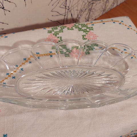 Vihreä astia. Terävä-terävä kulma 34 cm, leveys 23 cm. Korkeus 4,5 cm