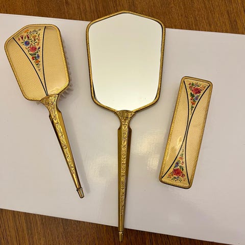 Harvinainen antiikkinen metallinen rasia, jossa poskipuna, puuteri ja peili kahdella vahvuudella. Valitettavasti peilit ovat rikki.