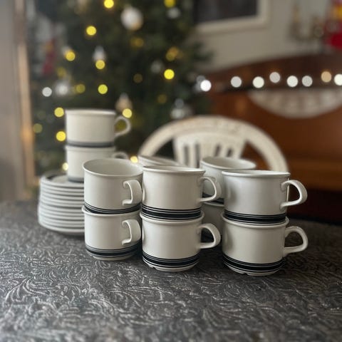 Uudenveroiset ja ehjät Faenza Mustaraita mokkakupit ja asetit 6 paria.Kuppi kork.6cm. ja halk.n.8cm. asetti halk.15cm.