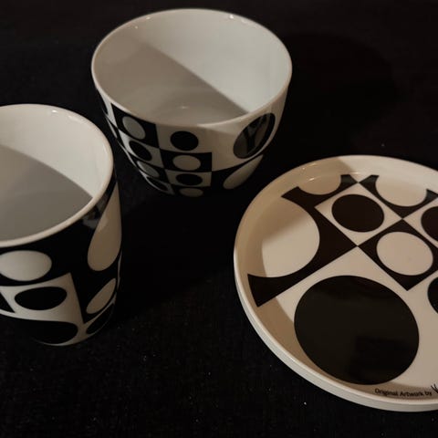 Neljä Verner Panton suunnittelemia termomukeja alkuperäispakkauksessa yhteensä 40 €. Nouto Alajärveltä, Katajanokalta tai Tori Diilinä.