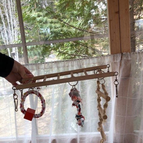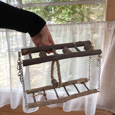 Isokokoinen keinu, pieni kiipeilyteline josta puuttuu kellot ja pieni kookospesä.