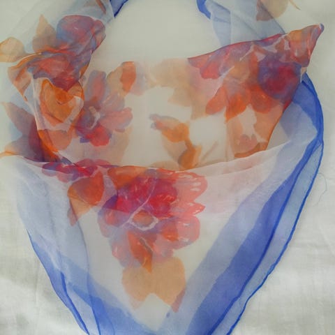 Retro kukallinen sifonkihuivi sininen-oranssi-valkoinen huivi 67x67 cm