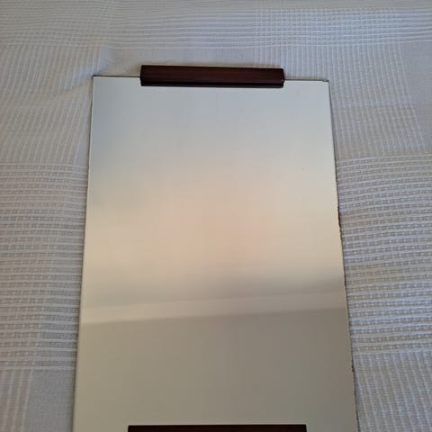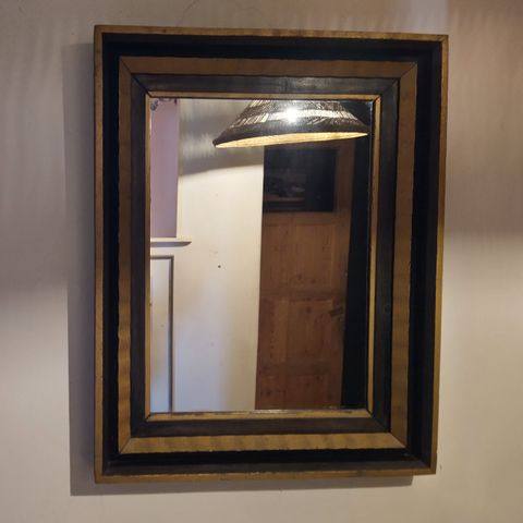 Kehys vähän kulunut ajan kanssa, maali rapissut paikoin. Peililevy on kuin uusi. Kiinnityslenkit paikoillaan ja ruuvit mukana.
