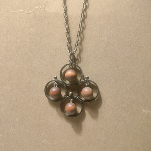 Aarikan kaulakoru, vintage. Ketjusta ja korusta molemmista löytyy leimat. Korussa Aarikka Finland. Ketjun pyöreässä laatassa Kaija Aarikka Finland.