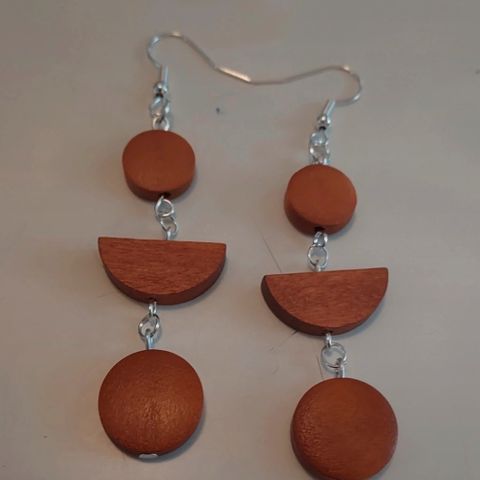 Nikkelittömät koukut, tummemman oranssi ympyrä puuhelmi 18mm, vaalean oranssi kartio 40x14mm.