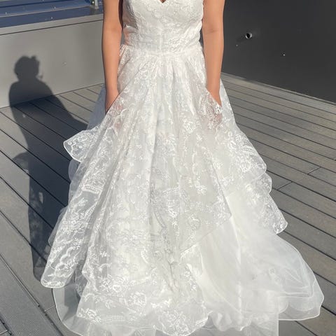 Kaunis, luonnonvalkoinen Dazzling by Zazabella häämekko. Tämä kaunis A-linjainen ja pitsikoristeinen häämekko on käyttämätön. Takana pieni laahus.