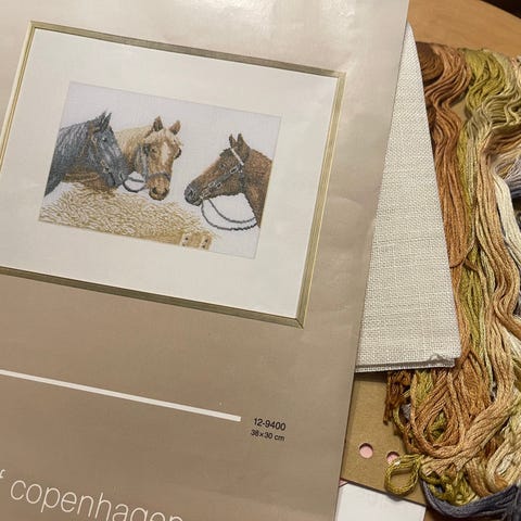 Vaikka heppa-tytölle tai pojalle. Ommeltu työ kooltaan 39x48cm, pohjakankaan koko 48x59cm, siististi tehty. Kuvan mukainen. Nouto ja käteismaksu tai lähetyskulut 7euroa.