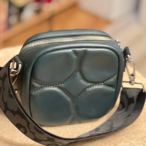 Marimekko nahkainen naisten laukku vihreällä värillä. Laukussa on useita taskuja ja vetoketjulliset osiot, sisäpuolella värikäs kuosi. Sopii arkipäivän käyttöön ja tarjoaa käytännöllistä säilytystilaa.