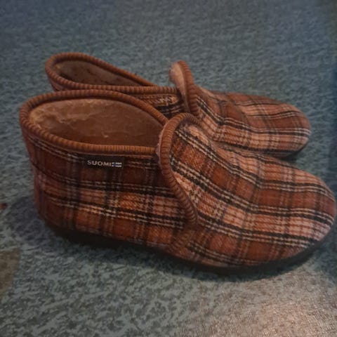 Kuvan siistit reino tossut. Kengan sisään kirjoitettu tussilla Kaisa. Koko hävinnyt. Pohjan mitta ulkopuolelta on 27 cm