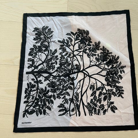 Kuvan Marimekon puuvillainen huivi, kuosin nimi "Lokki". Erittäin siisti. Tulee kirjeenä.
