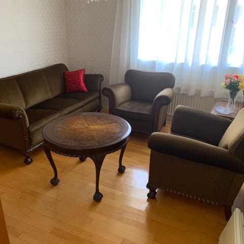 Sohvaryhmä: Kolmen istuttava sohva, kaksi nojatuolia ja sohvapöytä (korkeus n. 59 cm, halkaisija noin 84 cm)