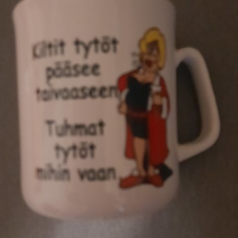 Lahjapaketissa kahvimuki, jossa "uusia suomalaisia sananparsia". Erinomainen lahjaidea huumoria ymmärtävälle. Uusi.