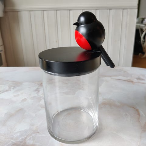 Uudenveroinen vitriinissä koreillut Aarikan Ruustinna lasikupillinen kulho. Käytetty vain pari kertaa. Väri ihana pionin pinkki, ensimmäisessä kuvassa sävy ei omalla näytölläni toistu oikein. Näitä on valmistettu vain vähän joten harvinainen tuote. Sisällä irrallinen konepestävä lasikulho, itse purkki ja helmet maalattua puuta. Korkeus 6 ja halkaisija 11,5 senttiä.