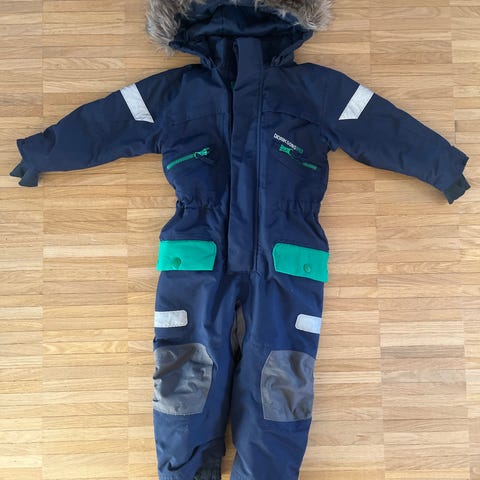 Didriksons toppahaalari koossa 80. Hyvä kunto, peppu ja polvet ehjät. Toinen jalkalenksu vaihdettu. Jalkalenksujen päällyskangas on melko kulunut. Hupun turkis puuttuu.