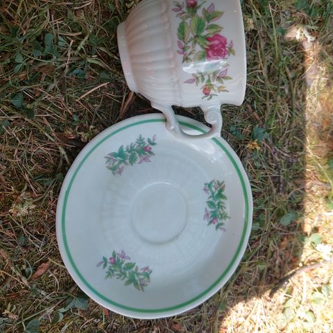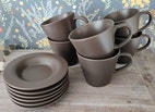 Kuusi kuppia ja lautasta. Kaikki ehjiä ja siistejä. Yhdessä kupissa likaa..