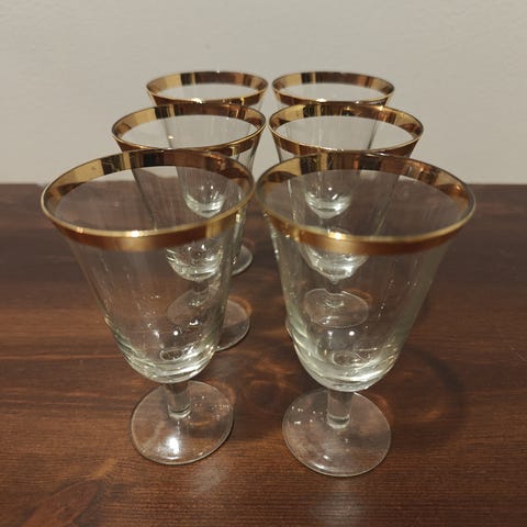 Pikarilasisetti, jossa viisi jalallista lasia. Kirkasta lasia, jossa pystysuuntainen koristehiomakuvio ja yläreunassa kultainen reunus. Sopii esimerkiksi likööri- tai jälkiruokajuomille. Myydään settinä kuvien mukaisesti. Halk 4,7 cm, korkeus 8,8 cm