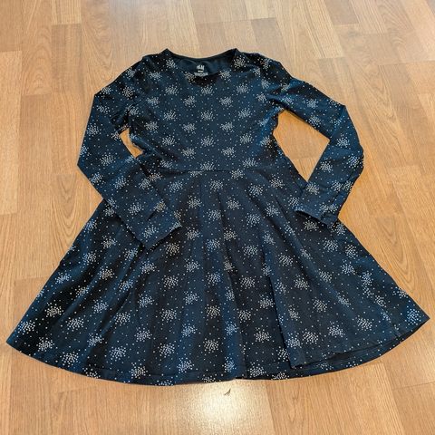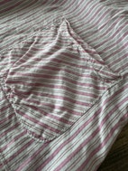 Hyväkuntoinen vaaleanpuna-valkoraidallinen mekko / tunika, H&M, koko 134. Materiaali ohutta 100% puuvillaa. Pitkät hihat. Edessä nappi ja koristerypytys. Kaksi taskua. Pituus olkapäältä helmaan 62cm. Säilytyksessä mennyt ryppyyn.