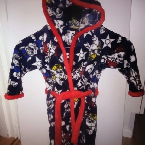Myydään Ryhmä Hau kylpytakki kokoa 100. Muuten ehjä ja siisti kunto, mutta molemmissa hihoissa ranteen kohdalla pienet reiät, katso kuvat.