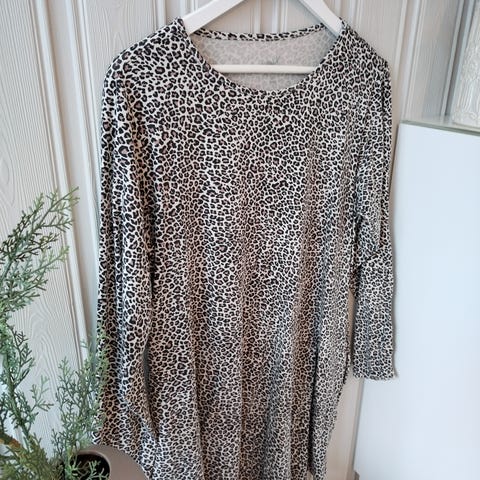 Uusi trikoomekko jossa peplum leikkaus sekä leopardi yksityiskohdat
