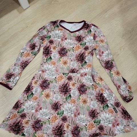 Leveähelmainen kukkamekko. Leveä kellohame. Ei rispaantumisia, mutta kangas hienoisesti uudesta haalistunut.