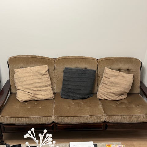 Päällisissä vetoketjut, vesipestävät (myydään pesemättömänä). Isommassa sohvassa istuinpehmusteen päällisessä rispaantuma, tästä kuva. Käyttämätön pala päällyskangasta (n.135x160cm) ja samasta kankaasta pari sisustustyynyä mukaan.