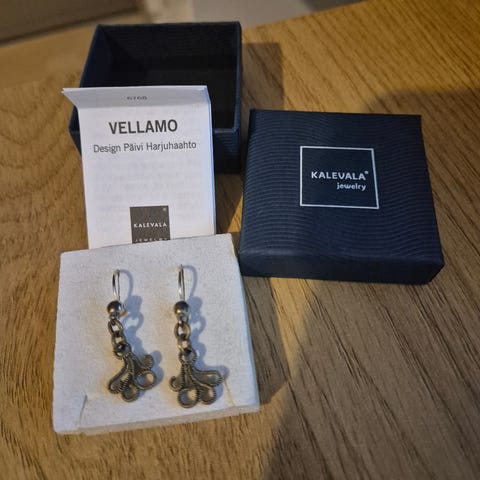 Kalevala korun pronssiset Vellamo korvikset, käytetyssä kunnossa eli vähän tummuneet ja vihertyneet. Koukut varmaankin hopeaa. Rasiaa ei tallessa.
