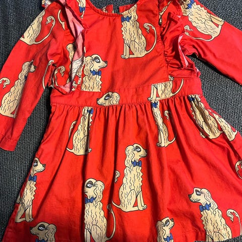 Paljon käytetty Mini Rodini -mekko apinakuosilla, koko 92/98. Edellisen omistajan nimi kirjoitettu tussilla kääntöpuolelle kaula-aukkoon ja tämä erottuu hieman myös oikealle puolelle (ks. kuva). Muuta tahraa en löytänyt.