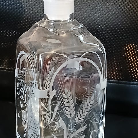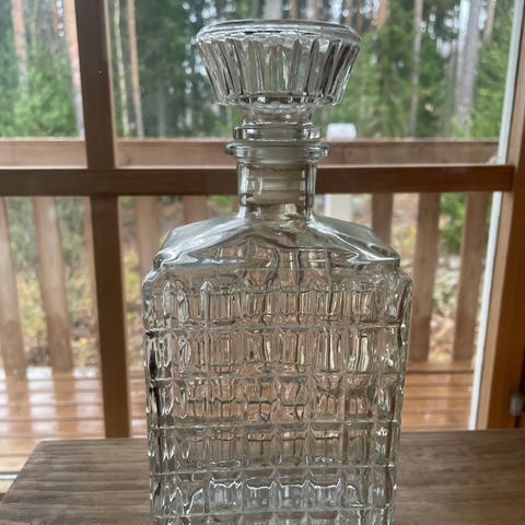 Lasinen viskikarahvi / konjakkikarahvi, jonka korkeus noin 27cm ja vetoisuus noin 7dl. Pohjassa "FRANCE" ja "5". Korkin korkkimateriaali / tiiviste kuivunut ja lohkeillut.