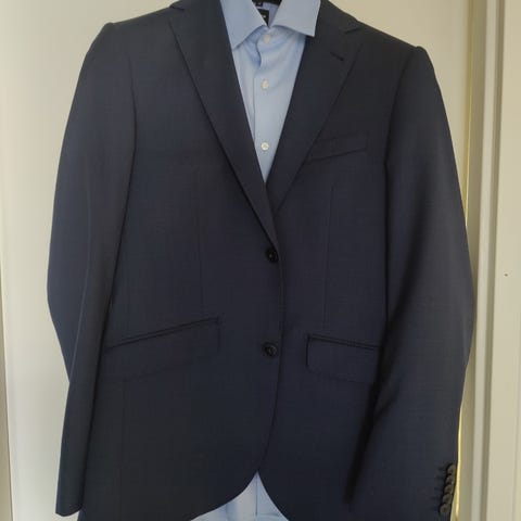 Muutaman kerran käytetty Rileyn puku, villasekoitetta. Takin koko 48, kapea malli. Hartialev. 45 cm olkasaumoista mitattuna, etukpl kainalo- kainalo n. 52 cm, pituus 74 cm.