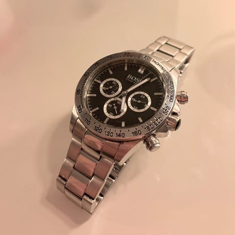 Myydään käytetty moitteettomassa kunnossa oleva miesten HUGO BOSS -rannekello, täysin uudenveroinen. Musta nahkaranne. Kello on hieman isompi kokoinen, näin ollen myös jämäkän ja hieman painavamman tuntuinen kädessä. Patteri loppunut käyttämättömyyden takia, vaihto maksoi kelloliikkeessä viimeksi noin 7-8€.