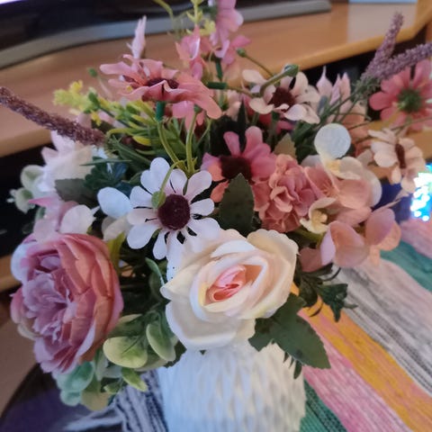 Keltainen tekokukka. Pituus varren kanssa 30 cm ja kukka osan halkaisija 10 cm.