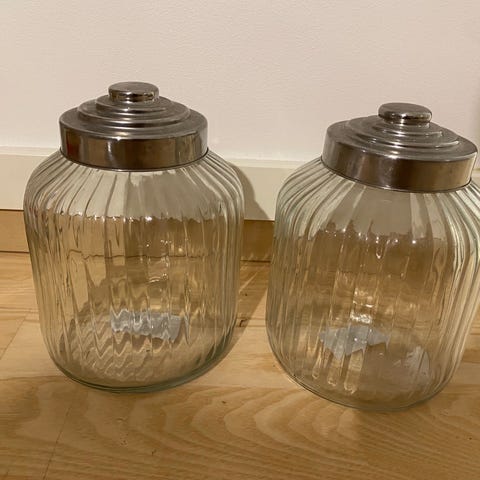 Kannellinen lasipurkki, jonka korkeus on 15 cm ja leveys 13 cm (ulkomitta). Vetoisuus 0,8 L.