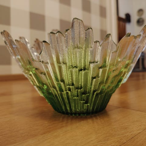Humppilan iso Revontulet kulho. Signeeraus Tauno Wirkkala -78 Humppila Finland Halkaisija 33 cm, korkeus 19 cm, paino 2,78 kg. Vähäisinä käytön jälkinä pienen pieniä naarmuja pohjassa.