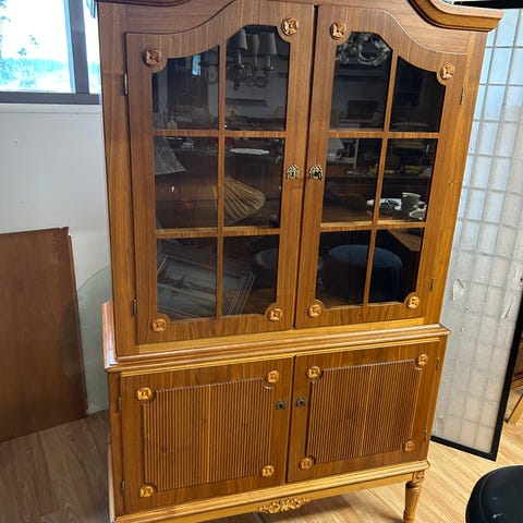Myydään kustavilainen astia-vitriinikaappi. Kaapin korkeus 166, leveys 96, alaosan syvyys 46, yläosan syvyys 36.