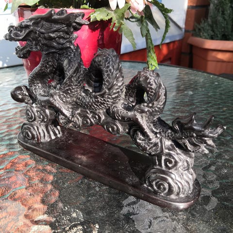 Lohikärme koristeet 2 kpl. Isompi kork. 29 cm ja kynttilänjalka 13 cm. Kynttilän jalasta puuttuu 2 palasta.