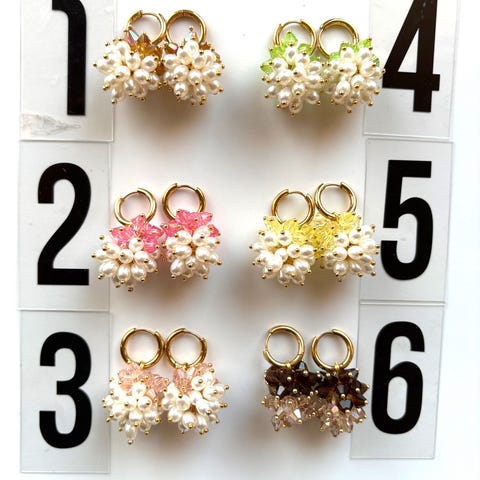 Kukkaaiheiset hopeaa, helmiäiskorut halkaisija 2 cm.