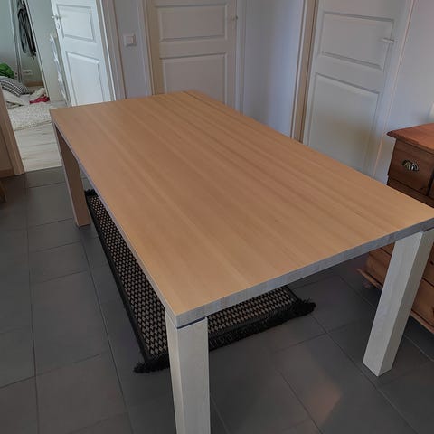 Pöydän kunto: Tukeva ja kaunis kunnon massiivikoivuinen ja puusepän tekemä pöytä. Pöytälevyn lakassa naamuja. Katso kuvat.
