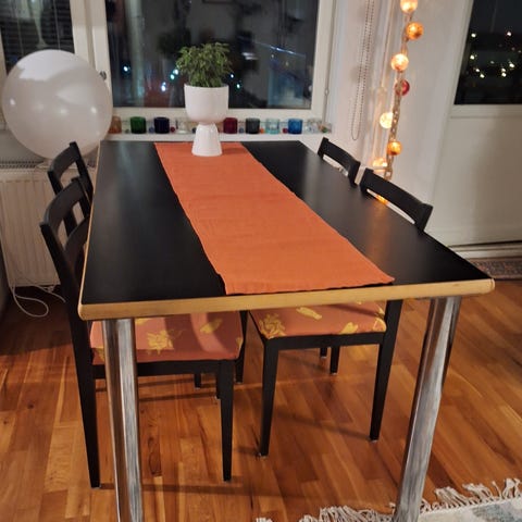 Tainus -pöytä, pituus 130 cm, leveys 85 cm ja korkeus 74 cm. Pöytälevy, sivusarjat ja jalat mustaksi petsattua massiiivikoivua. Lakattu matalla lakalla. Pöydän suunnittelija: Arkkitehti Juha Mäkelä. Uuden pöydän hinta on 930 euroa. Mallipöytä myydään poistohintaan: 60 euroa (sis.alv.25.5%).
