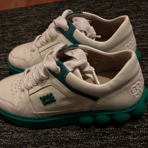 Nahkaa, luonnonkumipohja. Käyttämättömät, alkuperäisessä pakkauksessaan. Tarkemmat tuotetiedot löytyvät minnaminna.com -sivustolta. (Ovh 330,-e)