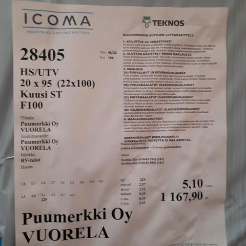 5,10 metriä pitkää vaaleaksi välimaalattua (F100) 20x95 UTV paneelia 1167,90 metrin nippu.