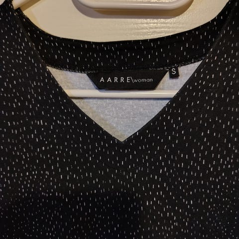 Aarre Karin button dress. Kuosi mustavalkoinen Rockyroad. Koko S. Väljä malli. Kainalo-kainalo 55 cm, olka-helma 96 cm. Trikookangas, joustaa ja laskeutuu hyvin. Voidaan käyttää kummin päin vaan, joko napit edessä tai takana. Napit eivät avaudu. Kunto varsin hyvä, maltillisesti käyttökertoja takana. Hajusteettomasti pesty.
