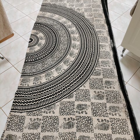 Uusi Finlaysonin sirkus aiheinen kangas. Koko 200 cm × 149 cm.