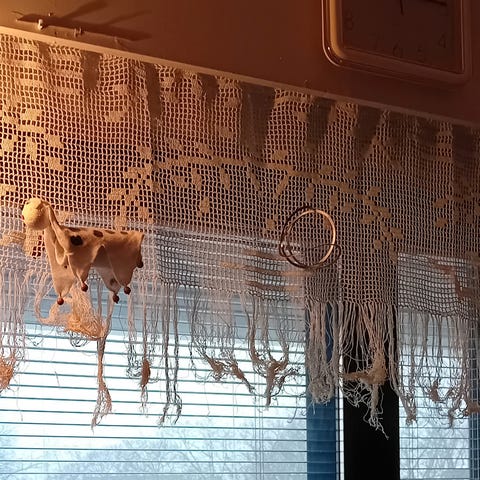 Myydään vaaleasta kalastajalangasta virkattu pitkä verhokappa. Retro kapan korkeus on n. 25 cm ja pituus n. 158 cm. Kunto on hyvä, ehjä ja siisti. Terassinouto Paloheinästä (Helsinki) ja maksu 20 e käteisellä.