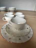 Myydään 1960-luvun Arabian Hippu-kahviastiasto, jossa on 5 kuppia Arabian kultareunuksista kahvikuppia mukana. Astiasto ollut yhdellä omistajalla omana aikanaan juhla-astiastona, joten kuppien ja lautasten kunto on erinomainen. Kultaukset edelleen kirkkaat, eikä halkeamia. Erittäin kaunis ja lähes uudenveroinen setti. Myydään mieluiten koko setti kerralla.