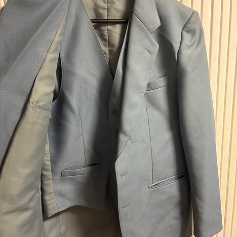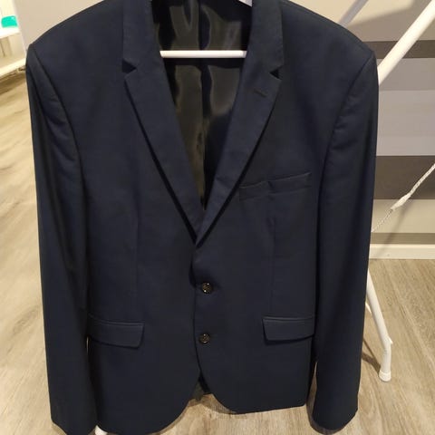Vanhempi miesten sininen puku. Raidallinen. Koko A50. Merkki: classic man. Puvussa takki, liivi ja housut. Voidaan mitata tarkemmin kiinnostuneille. Siistissä kunnossa. Savuton ja hajusteeton talous. Taloudessa kissa, mutta nämä säilytetty eri paikassa kuin kissat.