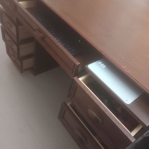Kirjoituspöytä vetotasot ja neljä laatikkoa puolellaan keskellä leveä laatikko.
